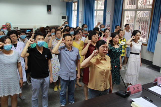 三是表彰先进,重温入党誓词。7月1日,中心党委召开纪念建党99周年暨表彰大会。会议在庄严的国歌声中拉开帷幕,会议对2019-2020年度先进基层党组织、优秀党务工作者、优秀党员进行表彰,先进代表就个人先进事迹及经验做法作交流发言,鼓励大家学习先进典型的高尚品德,发扬心系病人、舍小家、顾大家的奉献精神。全体党员在院长吴虹的带领下重温入党誓词。