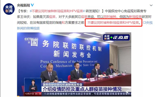 据中国疾控中心免疫规划首席专家王华庆:新冠疫苗研发时间较短,暂不建议同时接种新冠疫苗和 HPV 疫苗。除了 HPV 疫苗之外,北京等地区疾控也明确提出,暂不建议其他疫苗与新冠疫苗同时接种。