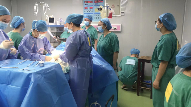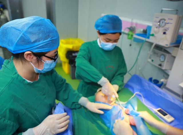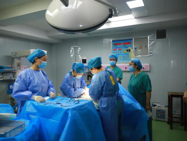 正在行剖宫产术,胎儿已顺利娩出,交台下新生儿科医师抢救