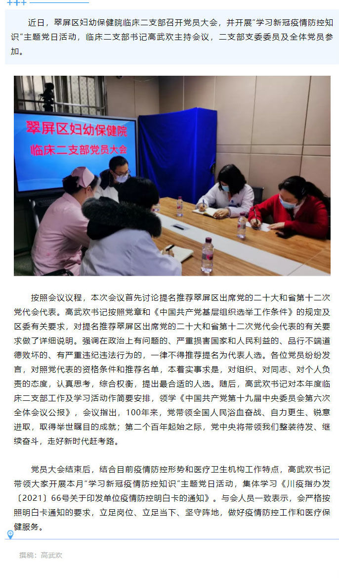 翠屏区妇幼保健院临床二支部开展“学习新冠疫情防控知识”主题党日活动