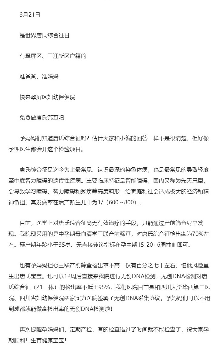 世界唐氏综合征日|快来翠屏区妇幼保健院免费做唐氏筛查吧!