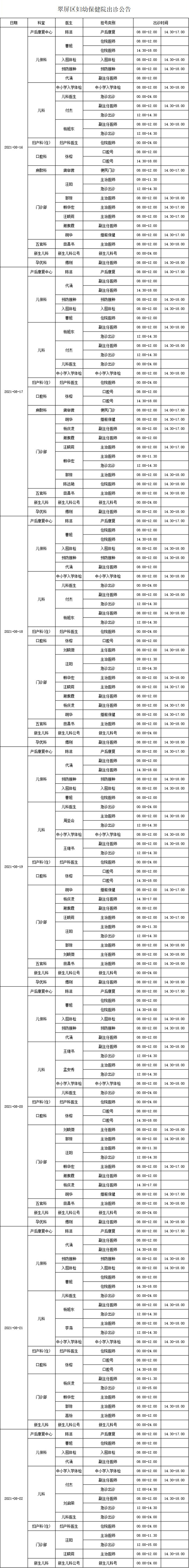 宜宾市翠屏区妇幼保健院2021年8月16日至22日出诊公告