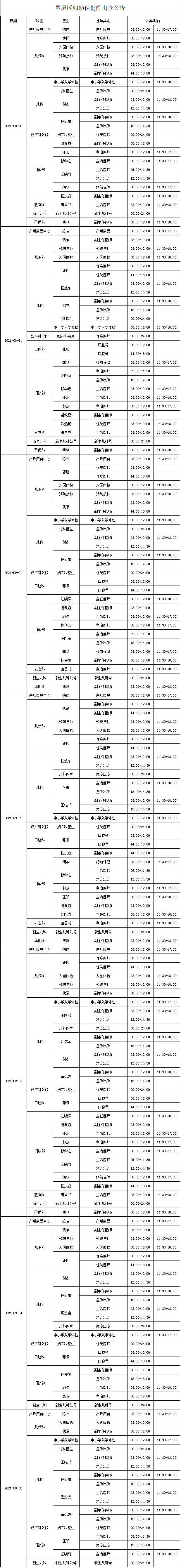 宜宾市翠屏区妇幼保健院2021年8月30日至9月05日出诊公告