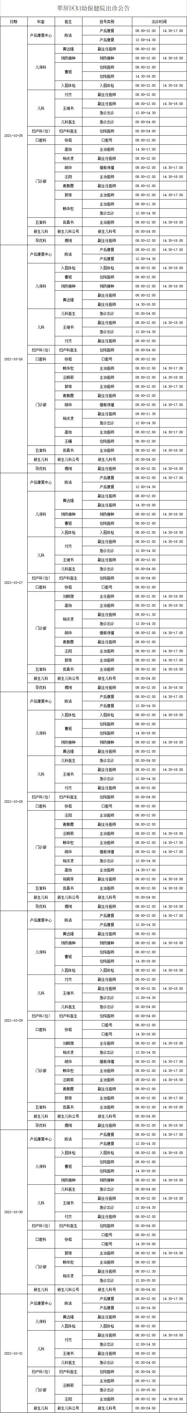 宜宾市翠屏区妇幼保健院2021年10月25日至10月31日出诊公告