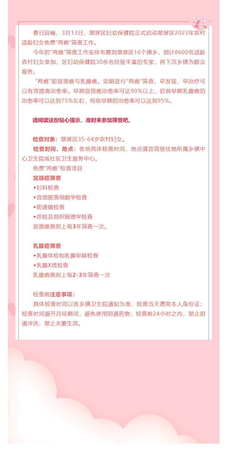 翠屏区妇幼保健院”两癌”筛查工作正式启动啦,请收好这份贴心小提示