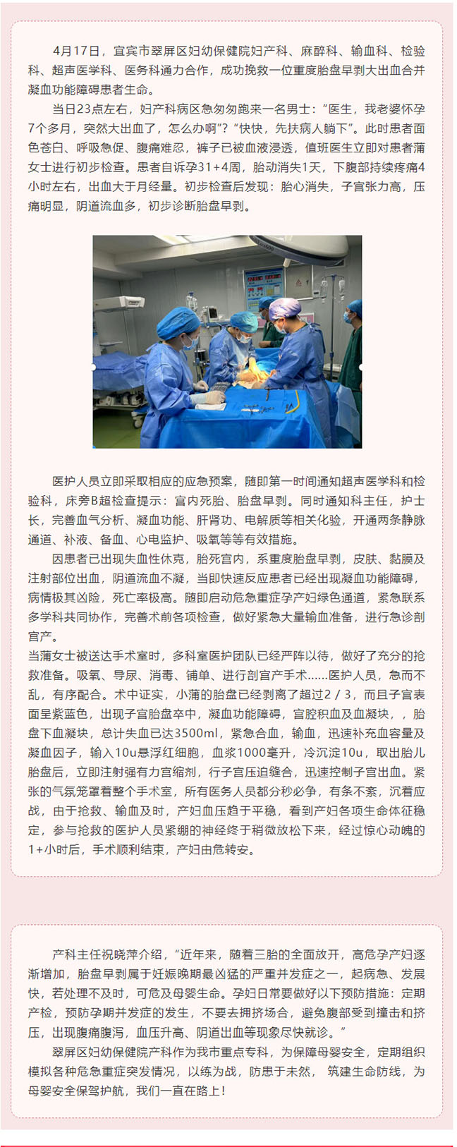 翠屏区妇幼保健院成功抢救重度胎盘早剥大出血合并凝血功能障碍孕妇